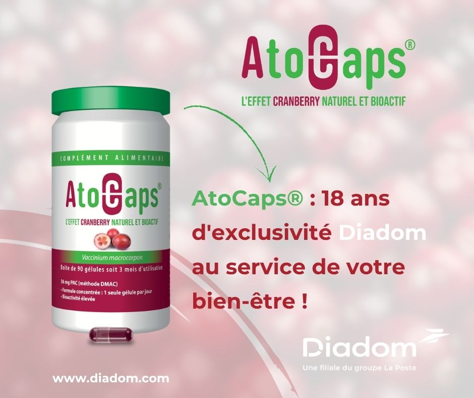 Depuis plus de 18 ans, Diadom est le distributeur exclusif du complément alimentaire naturel AtoCaps®, un produit à base de Cranberry VM (Vaccinium macrocarpon), reconnu par ses utilisateurs pour ses propriétés bénéfiques.