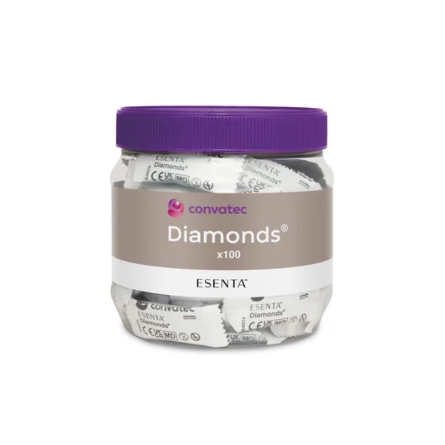 Les sachets gélifiants et désodorisants EsentaMD DiamondsMD/Diamants solidifient des selles molles à liquides et diminue l’excès de gaz pour un sac plus plat et plus discret.