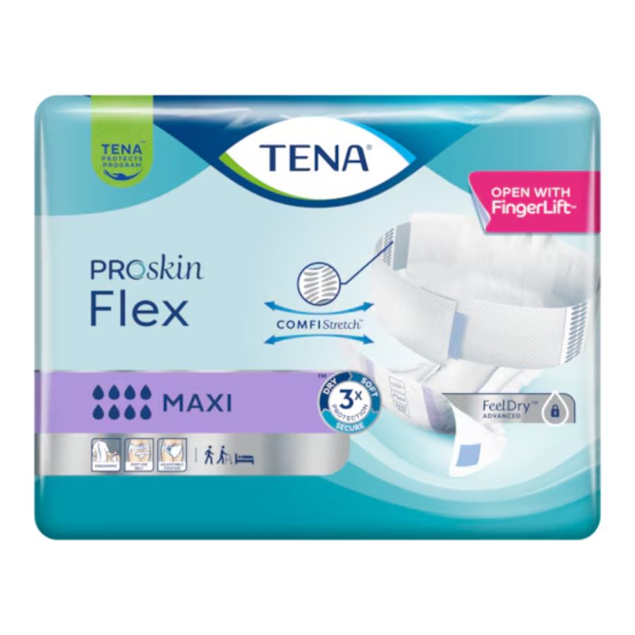 TENA Flex ProSkin Maxi est un change complet d’incontinence avec ceinture innovante, conçu pour faciliter les changes au quotidien, améliorer l’ergonomie des aidants et offrir une protection supérieure contre les fuites urinaires fortes. Il associe haute capacité d’absorption, confort optimal et sécurité anti-fuites renforcée.
